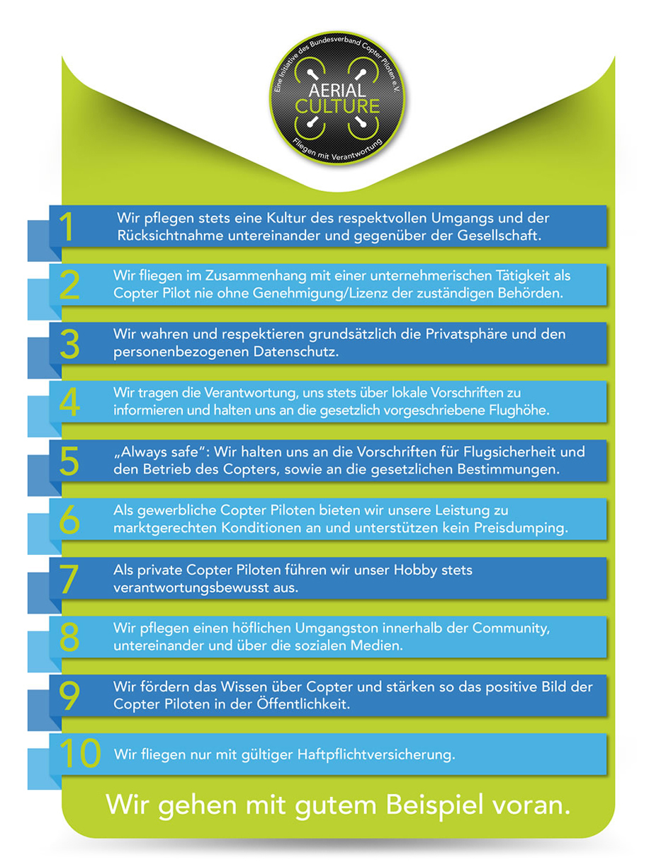 "Mit unserer Initiative “Aerial Culture – Fliegen mit Verantwortung” möchten wir ein positives Zeichen setzen, das nicht nur Verpflichtung nach innen ist, sondern ebenso ein Versprechen an die Öffentlichkeit, dass wir uns als Mitglieder des BVCP für verantwortungsbewusstes Fliegen und den rücksichtsvollen Einsatz von Coptern einsetzen."